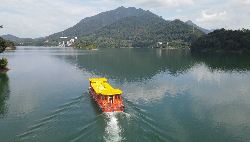 航线延伸至开阔水域,远眺形似卧牛的黄牛山轮廓分明,而沿途的流溪河水库大坝更显雄伟,这座大坝集防洪、灌溉、发电与旅游等综合功能于一体,实现了生态之美与工程之力的完美融合。