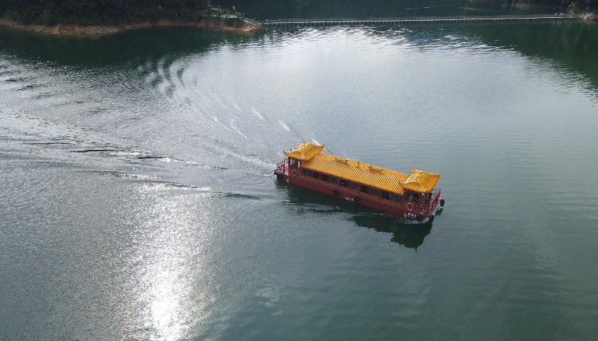 为了让游客获得更好的观景体验,景区游船采用360°全透明观景设计,方便游客观赏和拍摄山水美景,仿古造型重现江南风韵,船头设有茶座,游客可迎风品茗,尽享诗意。
